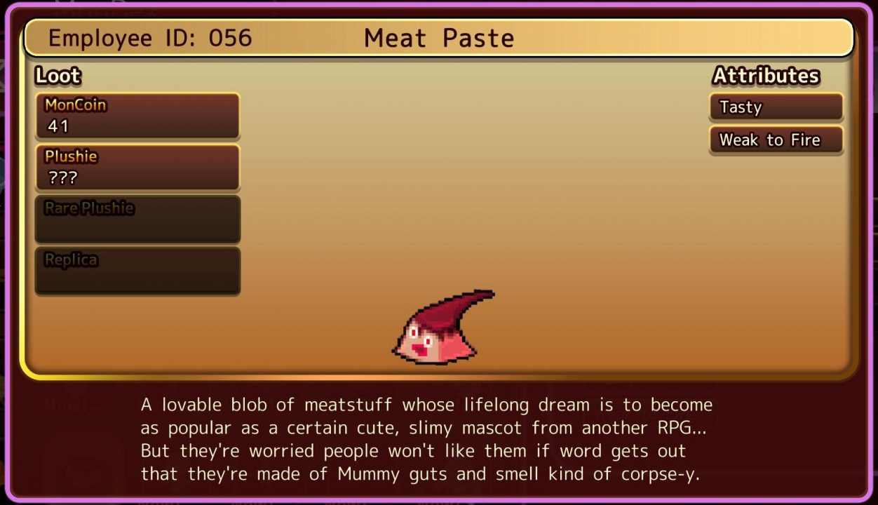 If there was something that Lori felt absolutely wasn’t going to have the same comedic value in Japanese, she would often change it to something more fun or relatable to Western players. Let’s take this description of the Green Tea Slug DX Plushie, for example: