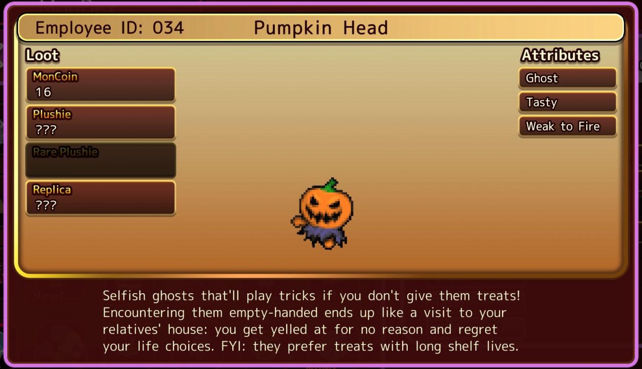 | いてはならないって…… カボチャの話だろ!? モンスターでもか? | Pumpkin Head | “Shouldn’t be here…” you’re talking about pumpkins, right?! Do monsters count, too? | I’m not?! But…you’re talking about the gourds! I’m a monster, remember?! Would you still arrest me for that?! | But I’m not actually a herbaceous vine, I’m just a monster who LOOKS like one. That’s not a crime, is it? |