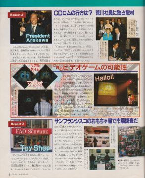• The Japanese magazine staff asks NOA President Arakawa about the upcoming Super Famicom and Super NES CD ROM accessory. Arakawa answers that he expects it to cost $200 and that the cartridge that goes in the system when using the CD drive will include a custom chip that allows for smoother and more colorful graphics. Apparently they already have some CD software and/or games up and running, which leads the reporter to remark that it’s surprising how far its development has advanced.