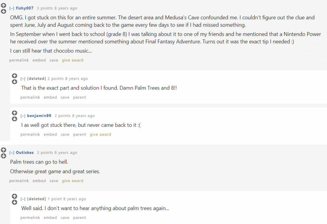 Again, if you’ve played Final Fantasy Adventure, there’s a good chance you got stuck on this part for a while. If you ever come across posts or reviews of the game, you’ll almost definitely find this “palm trees and 8” topic brought up: