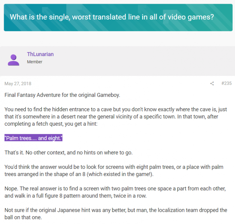 As we can see above, it’s commonly believed that this trouble spot in the game was due to its poor translation. In actuality, the palm tree hint isn’t much different from the original Japanese text. It was just a poorly designed puzzle to begin with.