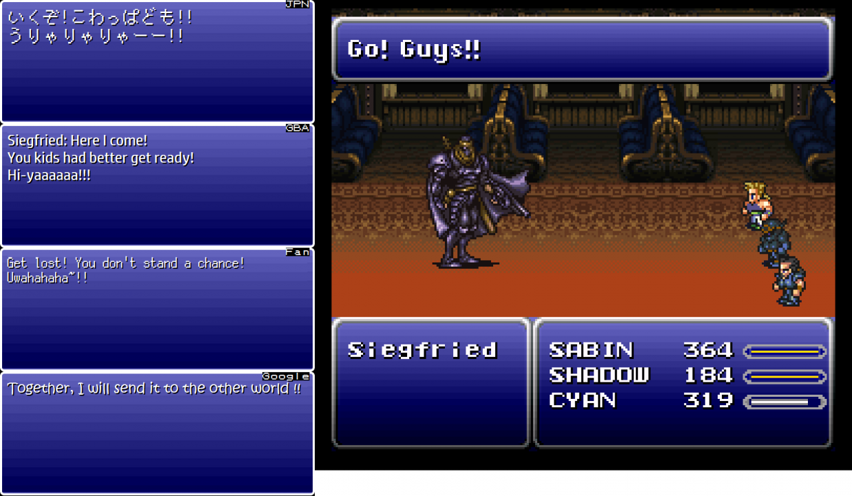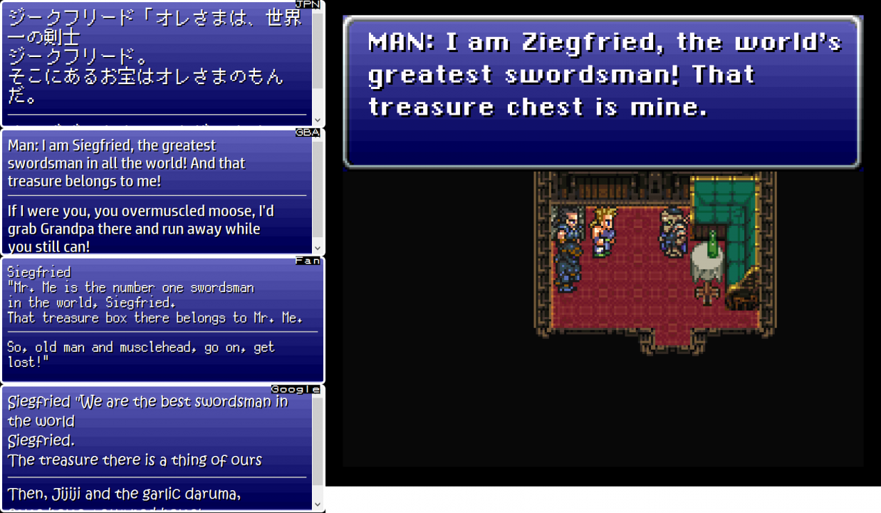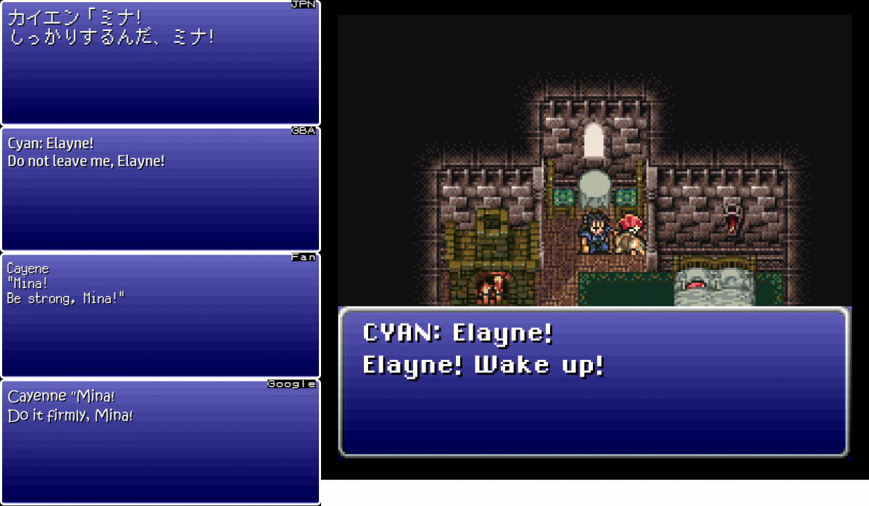 Given this, we can see that only the GBA translation gets this line right. The SNES translation, the fan translation, and the machine translation all fail in their own ways.