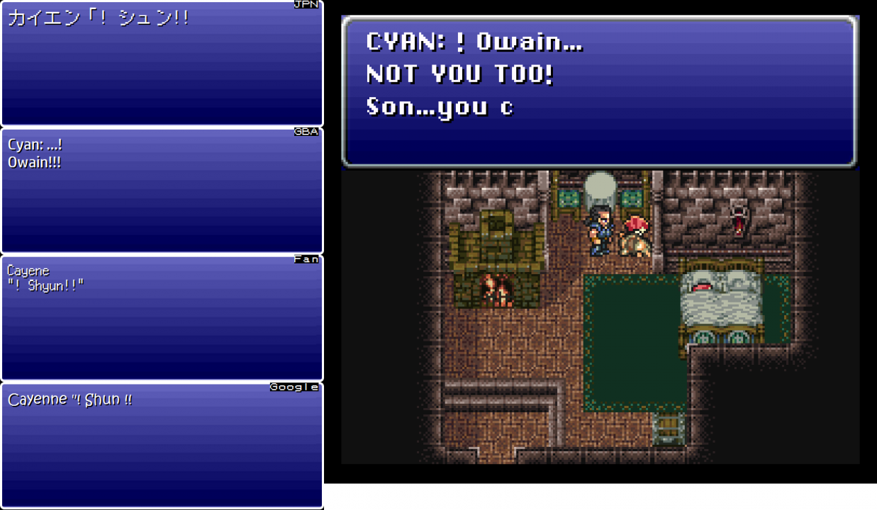 The Super NES translation sort of pushes Cyan’s Japanese introduction to the side comes up with something mostly new. The GBA translation is a mix between the Japanese version and the SNES translation, and the fan translation tries to stick closer to the Japanese text but stumbles in a few places. And the trickier-than-normal writing causes Google to stumble a bit more than usual as well.