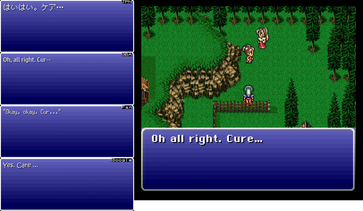 Anyway, in Relm’s case, we see that the Super NES and Game Boy Advance translators turned the third-person references into first-person. The fan translator preferred to keep her third-person style as-is.