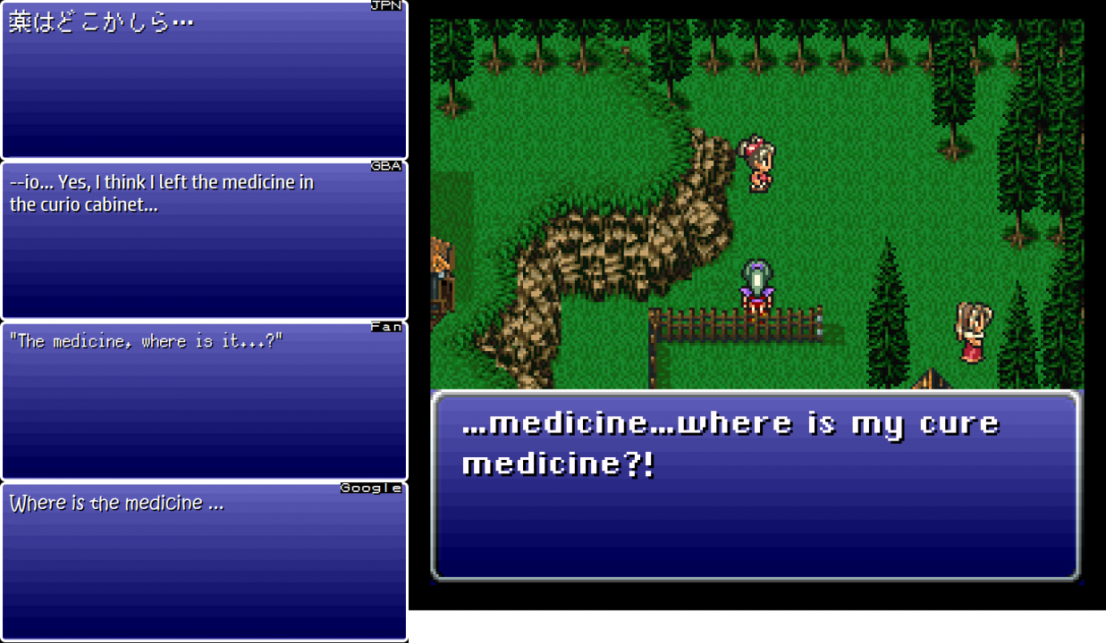 The GBA translation fixes all of the problems in this scene’s text. And we can see that the fan translation borrows from the faulty Super NES text.